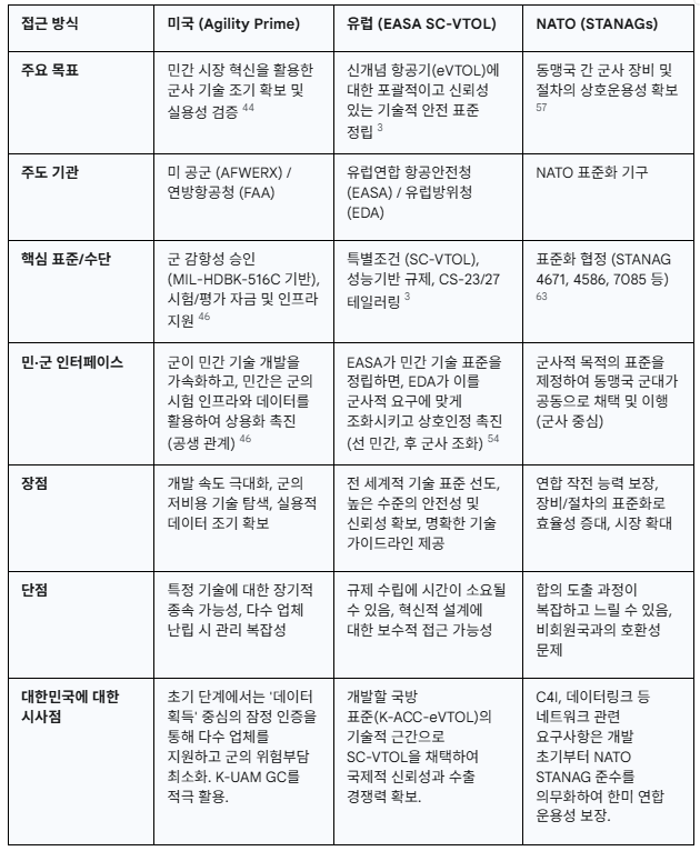 첫째, 감항인증 관련 표준이다. NATO는 무인항공기시스템(UAS)의 무게와 형태(고정익/회전익)에 따라 분류된 일련의 감항인증 표준(예: STANAG 4671, 4702, 4703 등)을 발전시켜 왔다.60 이러한 표준들은 회원국들이 군용 UAS를 인증할 때 참조할 수 있는 공통의 기술적 기반을 제공하며, 현재 VTOL 형태의 무인기에 대한 표준도 개발이 진행 중이다.64 이는 개별 국가가 아닌, 동맹 전체의 차원에서 안전 기준을 조율하려는 노력의 일환이다.