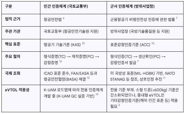대한민국의 항공기 감항인증은 국방 분야와 민간 분야에서 각기 다른 법률과 절차에 따라 관리되는 이원적 구조를 가지고 있다. 이는 각 분야의 목적과 요구사항이 상이하기 때문이지만, eVTOL과 같은 민·군 겸용(Dual-Use) 기술의 등장으로 인해 새로운 통합적 접근의 필요성이 대두되고 있다.