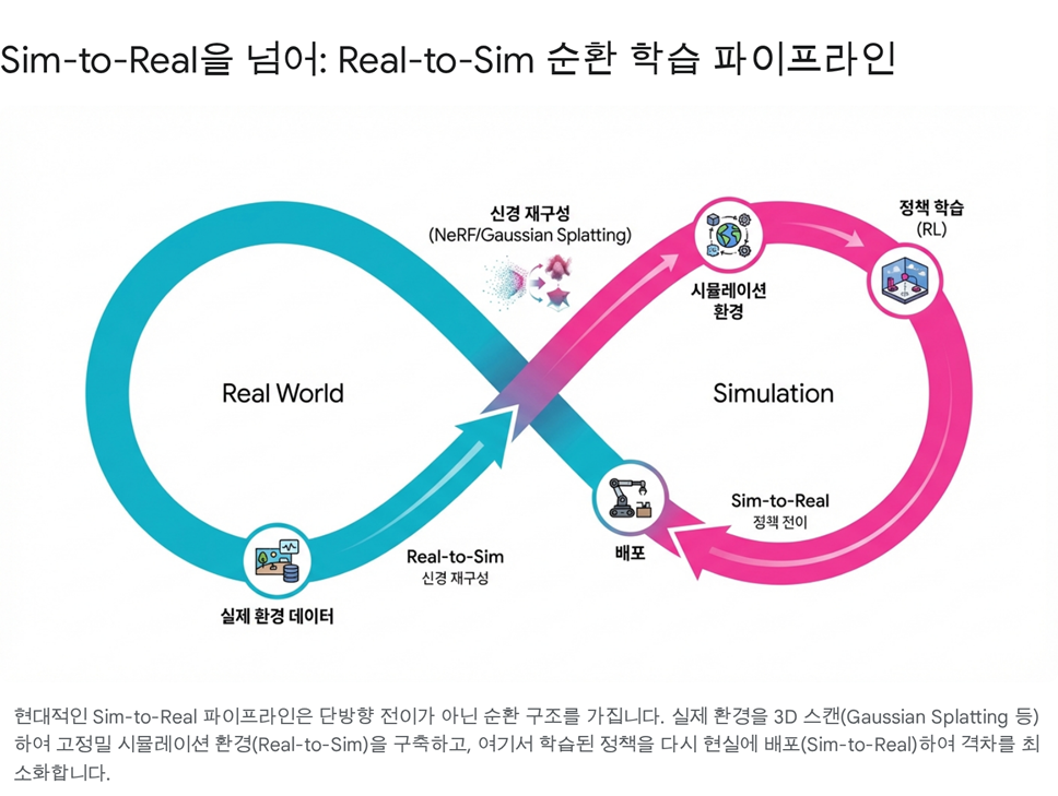 강화학습(RL)을 로봇에 적용할 때 가장 큰 걸림돌은 데이터의 샘플 효율성(Sample Efficiency)이다. 딥러닝 알고리즘은 수백만 번의 시행착오를 통해 학습하는데, 물리적인 로봇으로 이를 수행하는 것은 시간적으로 불가능할 뿐만 아니라 기계적 마모와 안전사고의 위험을 수반한다. 따라서 가상 환경(Simulation)에서 학습한 후 이를 현실 세계(Real World)로 전이하는 심-투-리얼(Sim-to-Real) 기술은 현대 로봇 공학의 필수 불가결한 요소가 되었다. 2025년 현재, 이 기술은 단순한 무작위화를 넘어 현실을 시뮬레이션 속으로 복제해 넣는 **리얼-투-심(Real-to-Sim)**으로 진화하고 있다.16