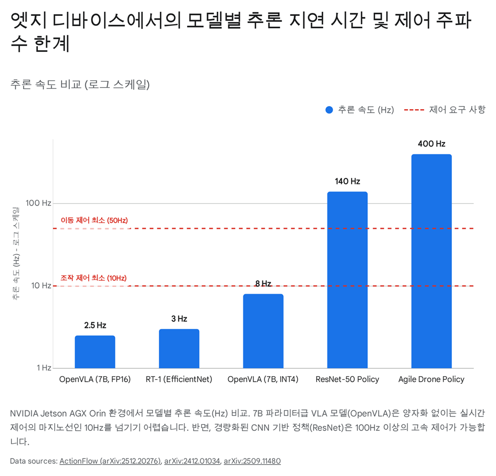 - 추론 속도(Inference Latency): 70억 개 이상의 파라미터를 가진 트랜스포머 모델은 추론에 상당한 연산량이 필요하다. 일반적인 엣지 디바이스(예: NVIDIA Jetson Orin)에서 OpenVLA 모델의 추론 속도는 초당 3~5회(3-5Hz) 수준에 머무르는 경우가 많다.12 그러나 드론 비행이나 휴머노이드의 균형 제어는 최소 50Hz에서 1000Hz의 제어 주기를 요구한다.